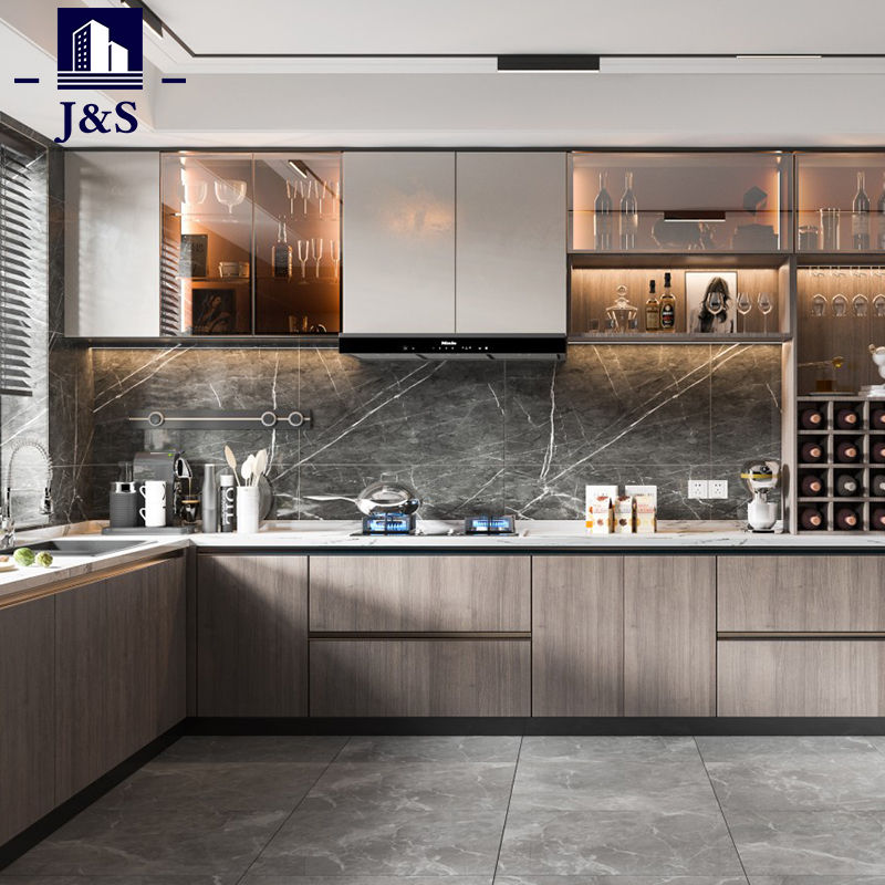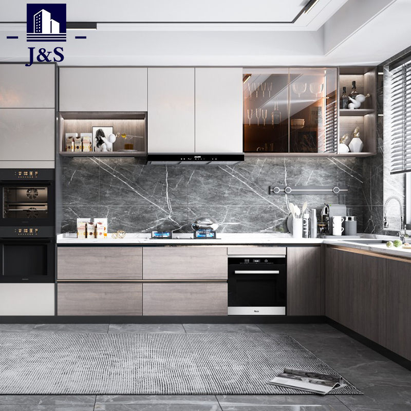 J&S furnizează Dulapuri de bucătărie modulare Dulapuri de bucătărie DIY Bucătărie de la fermă. Vopseaua ca material popular, astfel încât de-a lungul anilor a fost popular, orice design se bazează pe alb ca culoare de bază, adăugați niște granule de lemn, ușă de tavan din sticlă ca ornament, în ordine pentru a asigura functia de depozitare in acelasi timp fara a pierde frumusetea.